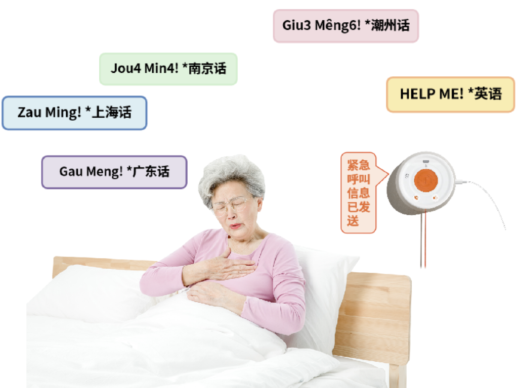 除了延伸原有紧急呼叫器的一键/拉绳呼救功能设计外,不仅可通过常见的“救命”、“救救我”等语音呼救词启动报警,还搭载AI语音学习功能,可精准识别呼救人声,长者能够使用普通话、各种方言(如广东话、湖南话、山东话、上海话等)和英语呼救,使老人在突发情况时可迅速发声呼救获取救助。