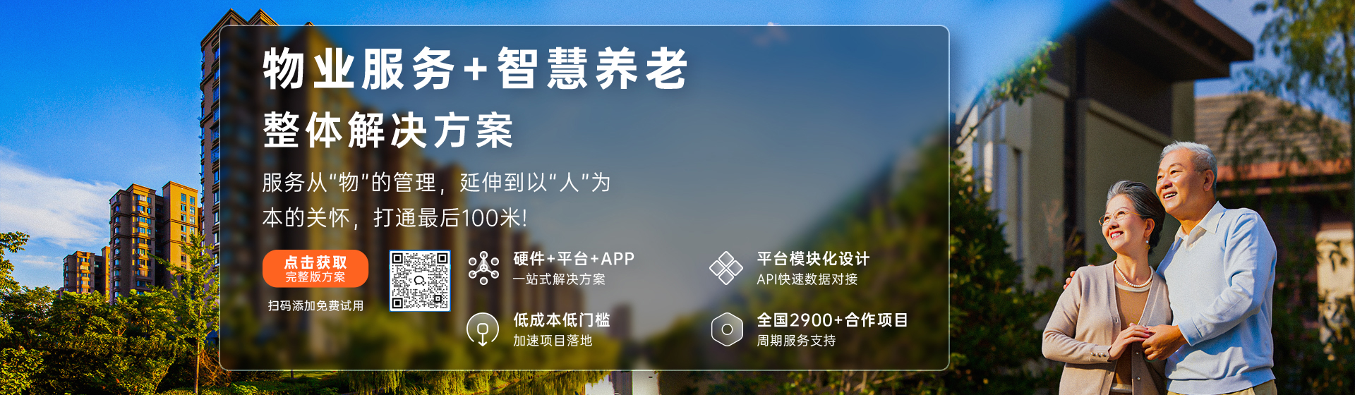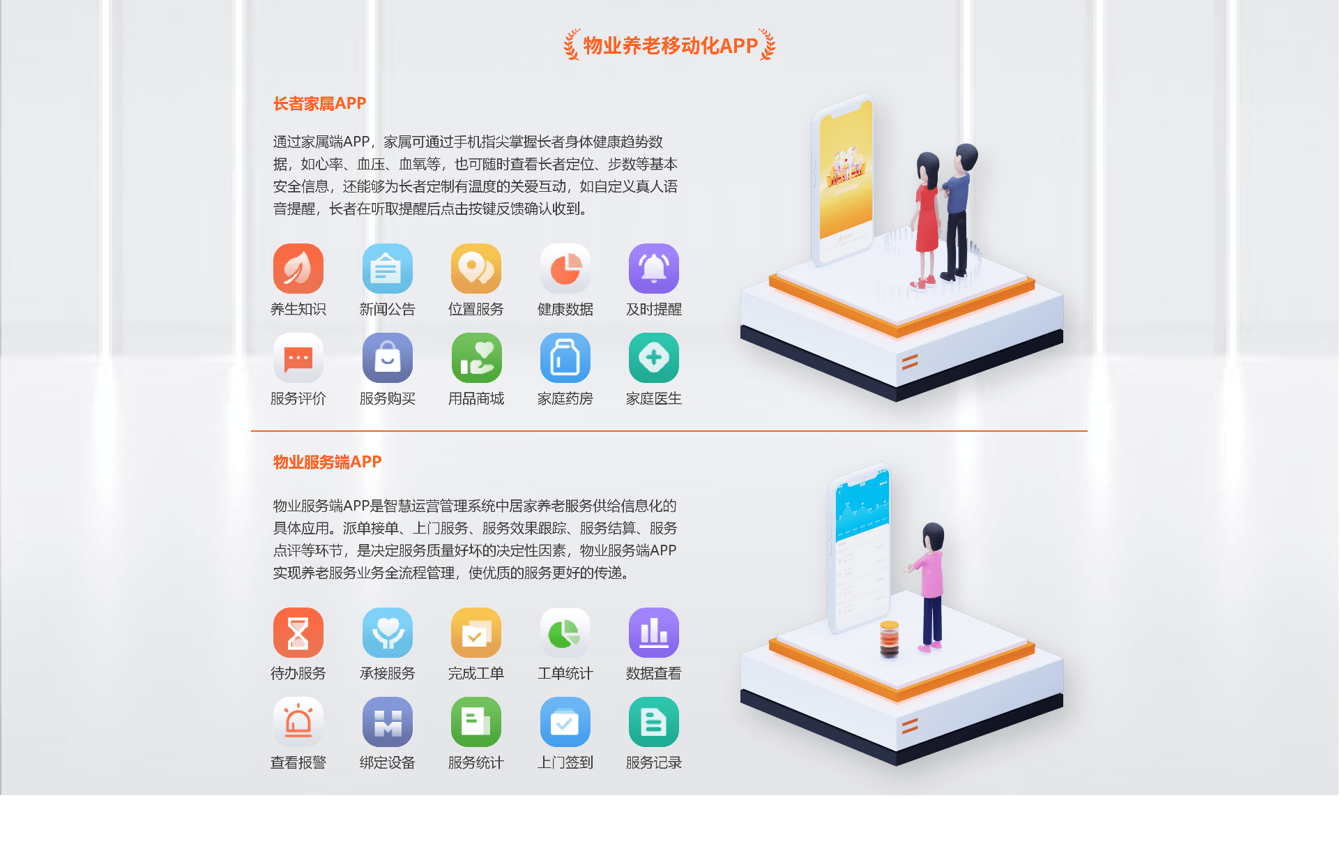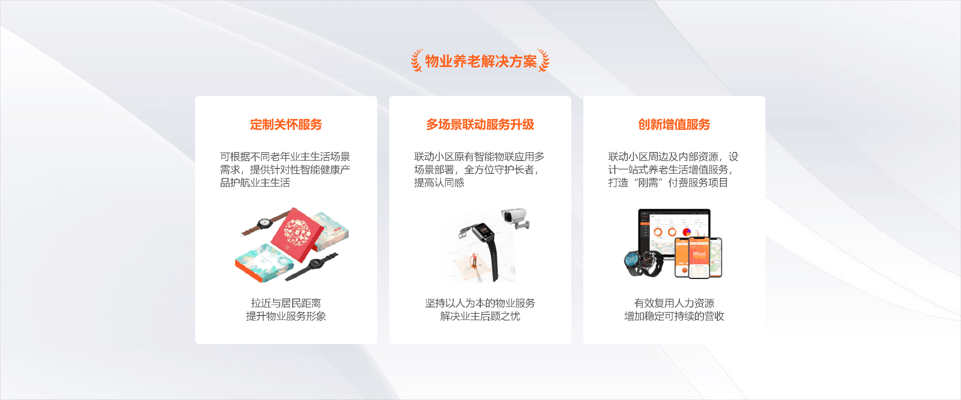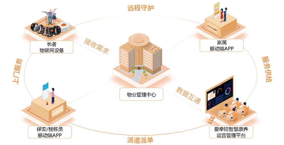 通过爱牵挂“终端+硬件+APP”整体解决方案,物业无需进行二次开发,即可直接将养老服务模块无缝嵌入平台。