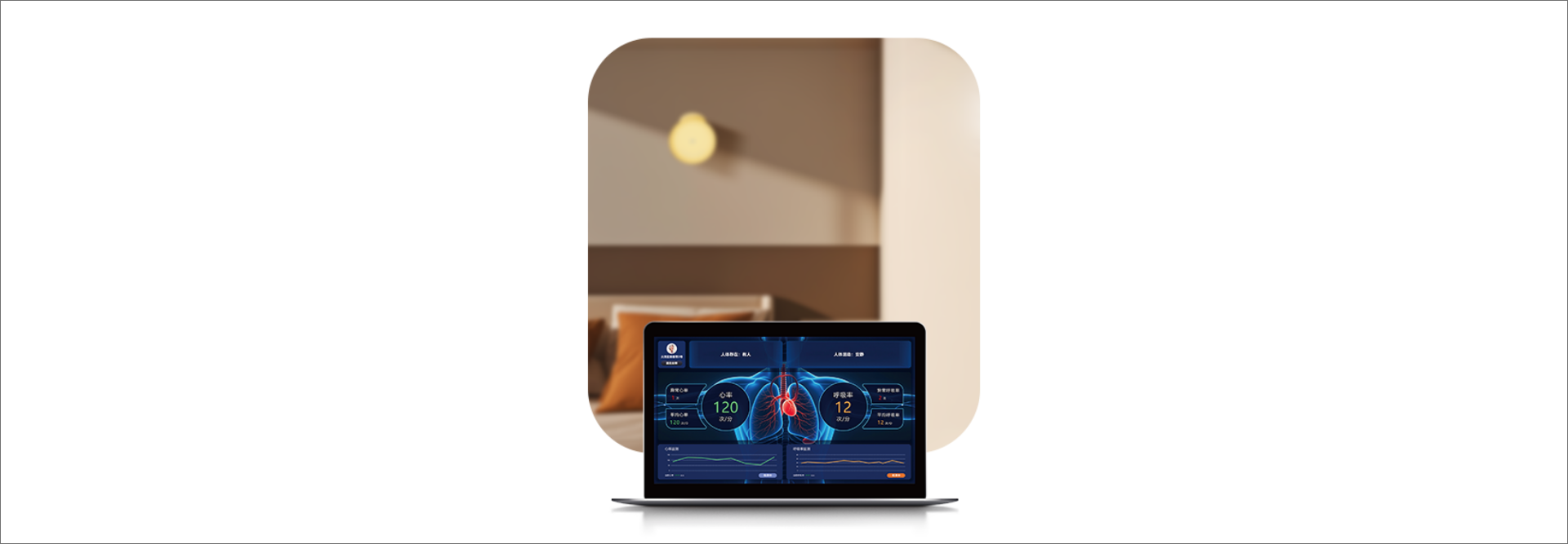UE可在与人体无任何接触、无画面感知下穿透衣物(厚衣服)、床褥(厚被子),不受睡姿影响监测用户心率、呼吸率等生命体征数据,并能清晰记录长者卧床、离床、翻身等体动时间或频次,保障隐私同时提高精确性,既能对可能存在的健康风险进行及时预警,又能有助于预防褥疮发生。